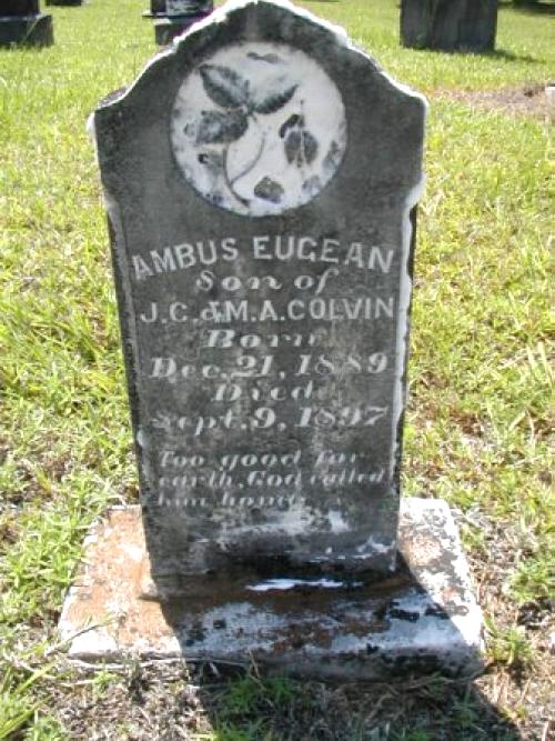 | Colvin, Ambus Eugean | 12/21/1889 | 9/9/1897 | "Son of J. C. & M. A. Colvin" "Too good for earth, God called him home." [s/o John C. & Martha Ann Senn Colvin] | RC & AR |