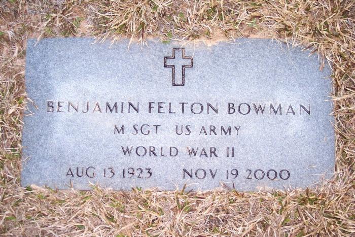 | Bowman, Benjamin Felton - NEW WITH PHOTO 3-6-2009 | Aug 13, 1923 | Nov 19, 2000 | Military Stone "M SGT US ARMY" "WORLD WAR II" Cross emblem | CeM |