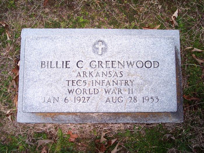| Greenwood, Billie C. - NEW WITH PHOTO 3-6-2009 | Jan 6, 1927 | Aug 28, 1953 | Military Stone "ARKANSAS" "TEC5 IINFANTRY" "WORLD WAR II" Cross in circle emblem | CeM |