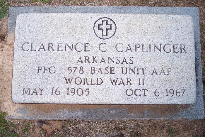 | Caplinger, Clarence C. - NEW WITH PHOTO 3-6-2009 | May 16, 1905 | Oct 6, 1967 | Military Stone "ARKANSAS" "PFC 578 BASE UNIT AAF" "WORLD WAR II" Cross in circle emblem | CeM |