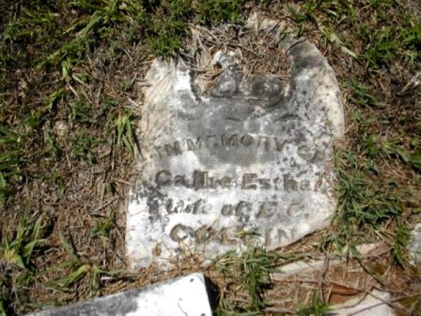 | Colvin, Callie Esther | 3/18/1863 | 8/6/1887 | "IN MEMORY OF" "wife of E. C. COLVIN" [Full Name : Callie Esther Lewis Colvin; w/o Edward C. Colvin] | RC & AR |