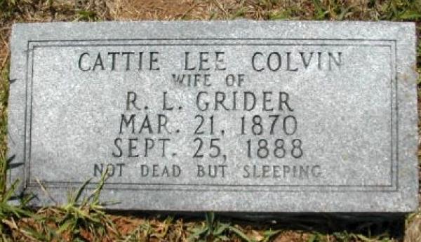 | Grider, Cattie Lee Colvin | 3/21/1870 | 9/25/1888 | "Wife OF R. L. GRIDER" "NOT DEAD BUT SLEEPING" [Full Name : Catherine Lee Colvin Grider; youngest d/o John Colvin of Farmville Community; 1st w/o Robert L. Grider] | AR |