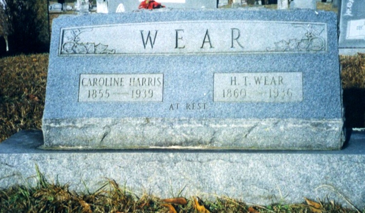 | Wear, H. T. | 1860 | 1936 | "AT REST" Double Stone with Caroline Harris Wear [Hamilton Tipton Wear; h/o 1.) Nancy "Nannie" Ann Virginia Singer who is probably also buried in this cemetery, but no headstone found; 2.) Caroline Harris Woods; daughter Edie Wear; sons William N., James D. and Tolbert H. Wear] | CM |