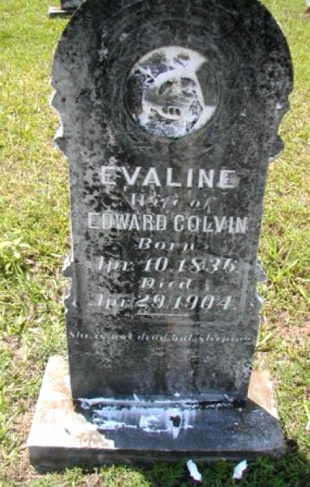 | Colvin, Evaline | 4/10/1836 | 4/29/1904 | "Wife of EDWARD COLVIN" "She is not dead but sleepeth" [s/o Bryant K. Adams] | RC & AR |