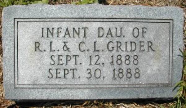 | Grider, Infant | 9/12/1888 | 9/30/1888 | "DAU. OF R .L. & C. L. GRIDER" [d/o Cattie Lee Colvin and Robert L. Grider; one of twins] | AR |