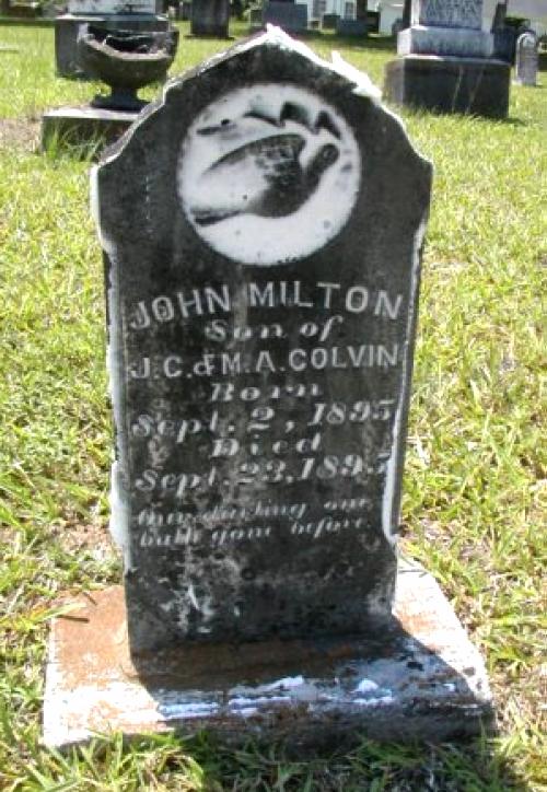 | Colvin, John Milton | 9/2/1895 | 9/23/1895 | "Son of J. C. & M. A. COLVIN" "Our darling one hath gone before" [s/o John C. and Martha Ann Senn Colvin] | RC & AR |