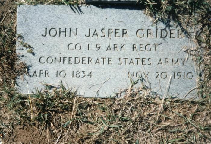 | Grider, J. J. - John Jasper | Apr 10, 1834 | Nov 20, 1910 | Another photo of headstone - NEW PHOTO 3-6-2009; Military Stone "CO I 9 ARK REGT" "CONFEDERATE STATES ARMY" [2nd h/o Susan Hall Castleberry] | JB & CeM |