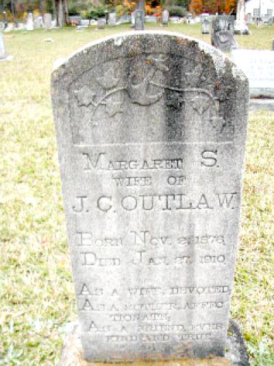 | Outlaw, Margaret S. | 11/2/1876 | 1/27/1910 | "wife of J. C. Outlaw" | MR & AR |