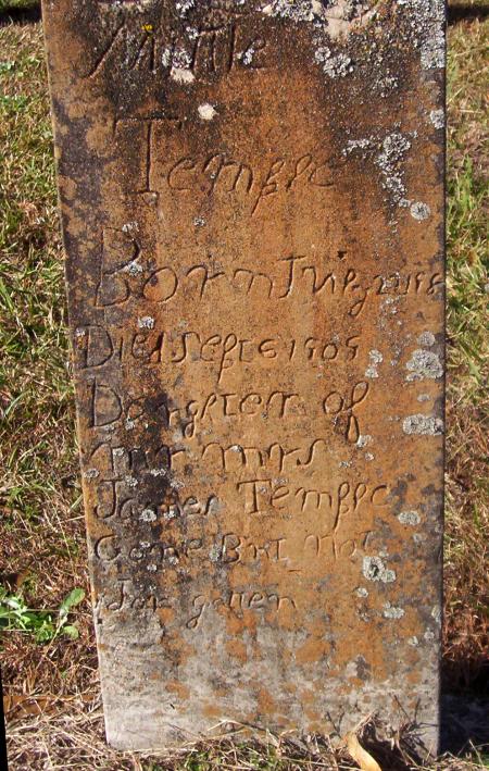 | Temple, Mattie | July 22, 1908? | Sept. 6, 1909 | Homemade tombstone in child-like writing “Daughter of Mr. Mrs. James Temple“ “Gone But Not Forgotten” | PC |