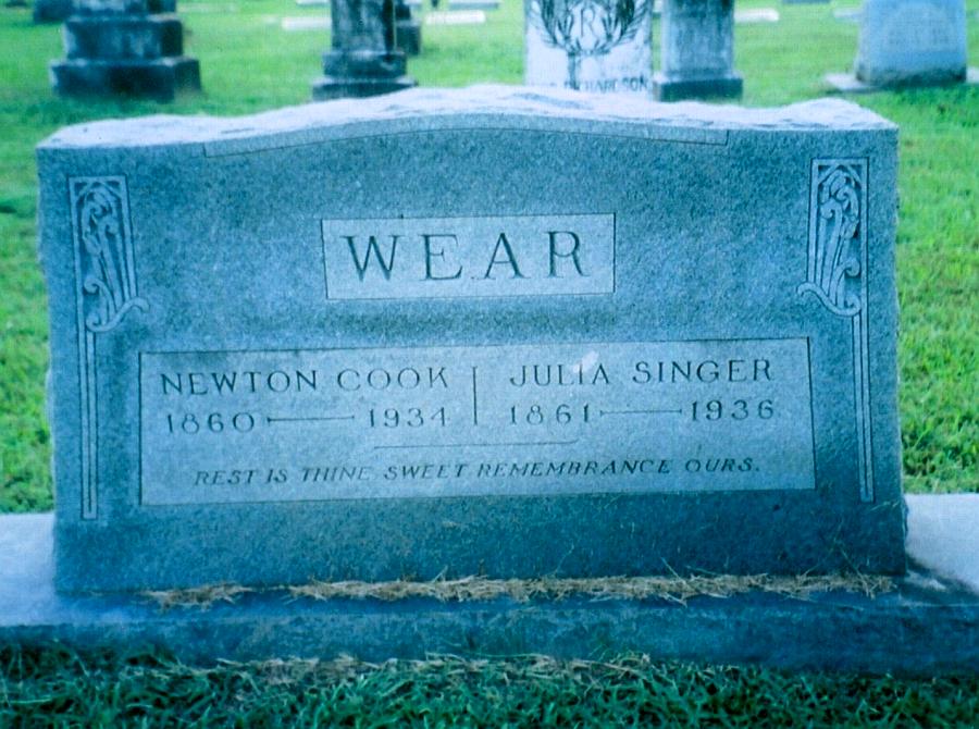 | Wear, Newton Cook | 1860 | 1934 | "REST IS THINE, SWEET REMEMBRANCE OURS" Double Stone with Julia Singer Wear | CM |