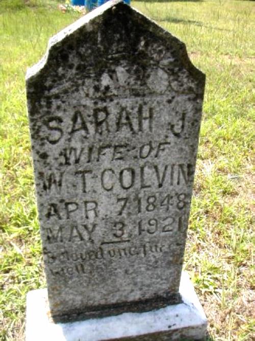 | Colvin, Sarah J. | 4/7/1848 | 5/3/1921 | "WIFE OF W. T. COLVIN" "Beloved one, farewell." [Full Name : Sarah Jane Outlaw Colvin; w/o William Thomas Colvin] | AR & RC |