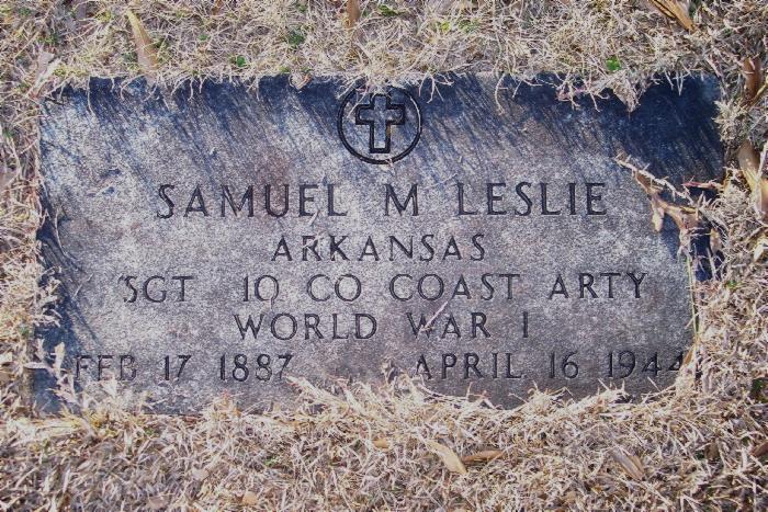 | Leslie, Samuel M. - NEW WITH PHOTO 3-6-2009 | Feb 17, 1887 | Apr 16, 1944 | Military Stone "ARKANSAS" "SGT 10 CO COAST ARTY" "WORLD WAR I" Cross in circle emblem | CeM |