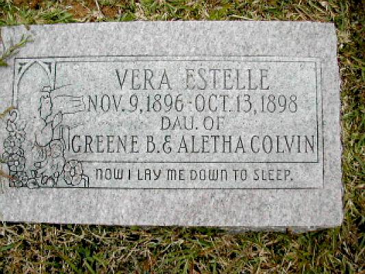 | Colvin, Vera Estelle | 11/9/1896 | 10/13/1898 | "DAU. OF GREENE B. & ALETHA COLVIN;" "NOW I LAY ME DOWN TO SLEEP" | AR & RC |