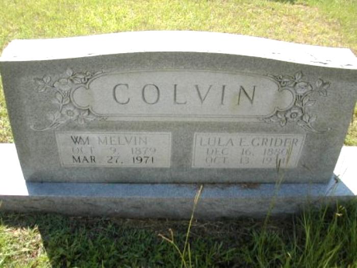 | Colvin, Wm. Melvin | 10/9/1879 | 3/27/1971 | Double Stone with Lula E. Grider Colvin [h/o Lula E. Grider Colvin; s/o William Thomas Colvin] | AR & RC |