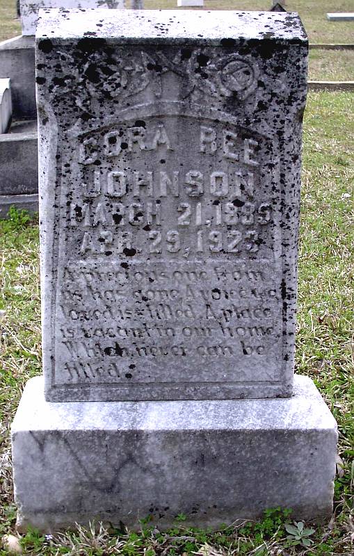 | Johnson, Cora Bee - NEW PHOTO 6-28-2007 | Mar. 21, 1885 | Apr. 29, 1923 | "A precious one from us has gone, A voice so loved is stilled. A place is vacant in our home, Which never can be filled." | BB & NJ |