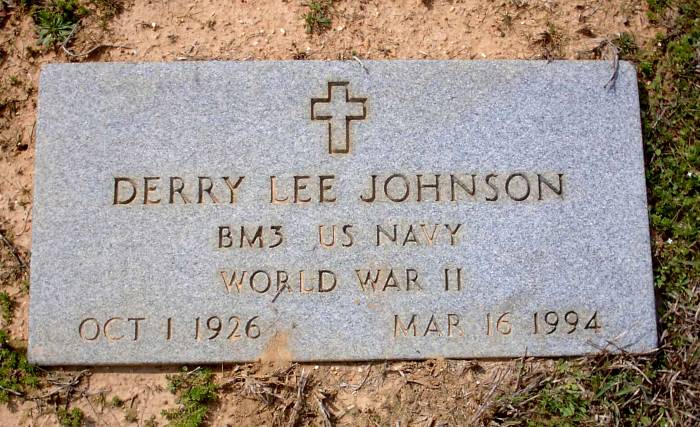 | Johnson, Derry Lee - NEW PHOTOS 6-28-2007 | Oct. 1, 1926 | Mar. 16, 1994 | Double Stone with Lena Laverne Johnson "WED JULY 1, 1949" Also a Military Stone "BM3 US NAVY" "WORLD WAR II" Christian Cross emblem [s/o Doyle & Nolia Johnson] | BB & NJ |