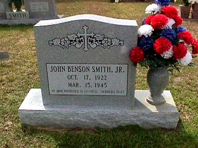 | Smith, John Benson Jr. - NEW BACK PHOTO 7-7-2007 | Oct 17, 1922 | March 15, 1945 | "HE WHO PROMISED IS FAITHFUL. HEBREWS 10:23" Back of Stone "DAUGHTERS TRENA RENA JOHNNIE" [Killed in World War II] | NJ |
