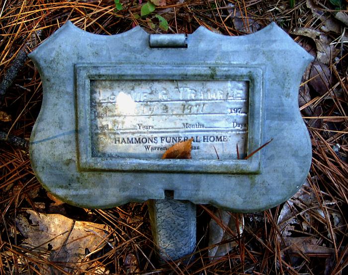PHOTO: NAME: BORN: DIED: NOTES & "WRITTEN ON STONE": PHOTO Fannie Hardy Currington Nov 1906 Feb 1987 "BELOVED MOTHER OF ROSIEVENE - IRA LEE - ESTHER" PHOTO Margrette Davis Dec 28 1912 "AGE NEAR 90 Years" PHOTO H. M. Hardy Jan 14 1873 Apr 10 1891 "... gone" PHOTO Ira Hardy 1905 1944 "HUSBAND" PHOTO Eddie Harrison Apr 19 1898 Nov 10 1911 PHOTO Mattie Bell Hodges 1930 2006 Hammons Funeral Home, Warren, Ark. marker PHOTO Irene Marks Hughes 1919 1971 Hammons Funeral Home, Warren, Ark. marker PHOTO Addie B. Jones Dec 19 1897 Dec 27 1990 "HER MEMORY LIVES ON" PHOTO Alexander Jones 1906 1967 "AGE 61" "ASLEEP IN JESUS" PHOTO C. B. Jones 1912 1972 Funeral Home marker PHOTO Charity Johnson Jones Apr 23 1888 Dec 9 1970 PHOTO Colvin Jones 1909 1983 "Age 74" Hammons Funeral Home, Warren, Ark. marker PHOTO Doyle Jones June 26 1923 Oct 18 1940 PHOTO Glenn Jones Aug 8 1927 Aug 17 1986 PHOTO Gus Jones Jan 18 1885 Nov 1 1968 Military Stone "ARKANSAS PVT US ARMY WWI" Cross in Circle Emblem PHOTO Isaac Jones 1935 1976 Hammons Funeral Home, Warren, Ark. marker PHOTO Troy Jones Nov 15 1919 Dec 26 1964 Military Stone "ARKANSAS ST1 US NAVY WWII" Cross in Circle Emblem PHOTO Virginia Jones "AGE 23 YRS" "Having served her generation By the will of God she fell asleep" PHOTO Katie Mae Lane 1903 1957 Hammon-Son Funeral Home, Warren, Ark. marker PHOTO Clarance Lovett July 23 1914 Oct 5 1917 "Son Of J. M. & A. LOVETTE" "No pain no grief no ?? fear, Can reach our loved one sleeping here" PHOTO George W. Lovett Jan 29 1859 Jan 2 1921 PHOTO Nelsie Lee Lovett Mar 23 1937 Sept 3 1963 "MOTHER" "REST IN PEACE" PHOTO Gordie L. Marks 1906 1984 "Age 78" Hammons Funeral Home, Warren, Ark. marker PHOTO Israel Martin 1896 1978 Hammons Funeral Home, Warren, Ark. marker PHOTO Anderson Mason Double Stone with Emma Mason "Aged 65 years" PHOTO Emma Mason Double Stone with Anderson Mason "Aged 40 years" "She has gone to heaven..." PHOTO Frank Mason 1907 1955 "AT REST" PHOTO Lonnie G. Tramble July 3, 1971 "71 years" Hammons Funeral Home, Warren, Ark. marker PHOTO Clemmie Williams 1899 1964 Hammons Funeral Home, Warren, Ark. marker PHOTO Agnes Lee Yon Aug 17 1911 June 8 1971 PHOTO Unknown 1887 1960 Funeral Home marker PHOTO Unknown "Gone to a better land" PHOTO Unknown Funeral Home marker PHOTO Unknown Funeral Home marker PHOTO Unknown Funeral Home marker PHOTO Unknown Funeral Home marker PHOTO Unknown Funeral Home marker PHOTO Unknown Funeral Home marker PHOTO Unknown Funeral Home marker PHOTO Unknown Funeral Home marker stake PHOTO Unknown Funeral Home marker PHOTO Unknown Funeral Home marker One of the Unknowns is Mattie Hardy One of the Unknowns is Cid or Sid Jones, 1891 - 1957 One of the Unknowns is Brady or Bradley Roshell, died Feb 7 1972 "63 years" |