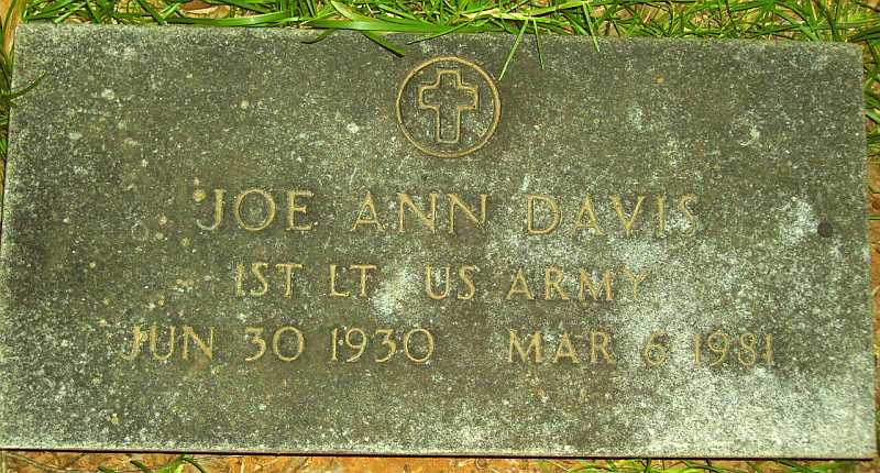 | DAVIS, JOE ANN | JUN 30 1930 | MAR 6 1981 | "1ST LT US ARMY" Christian Cross in circle emblem |