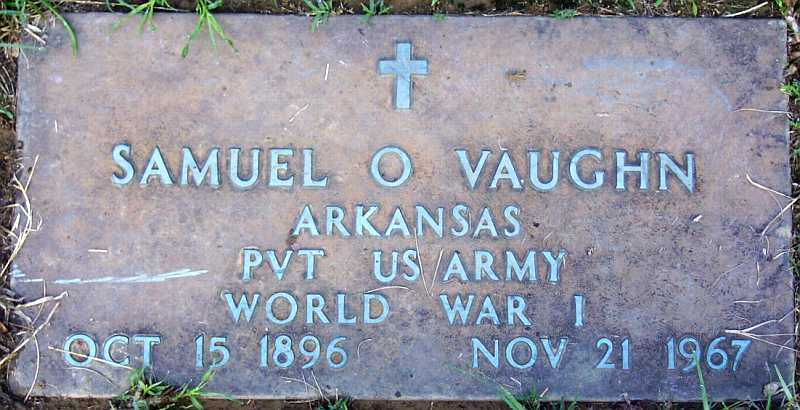 | VAUGHN, SAMUEL O. | OCT 15 1896 | NOV 21 1967 | "ARKANSAS" "PVT US ARMY" "WORLD WAR I" Christian Cross emblem |