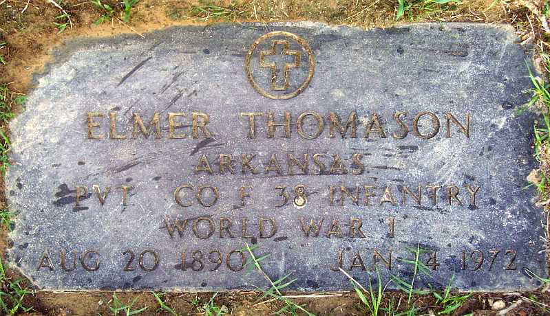 | THOMASON, ELMER | AUG 20 1890 | JAN 14 1977 | "ARKANSAS" "PVT CO F 38 INFANTRY" "WORLD WAR I" Christian Cross in circle emblem |