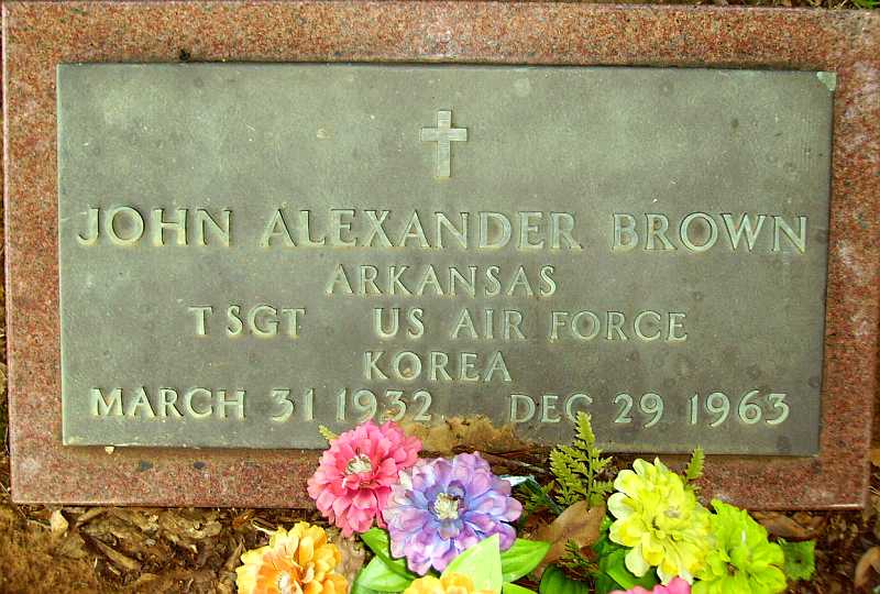 | BROWN, JOHN ALEXANDER | MARCH 31 1932 | DEC 29 1963 | "ARKANSAS" "T SGT US AIR FORCE" "KOREA" Christian Cross emblem |