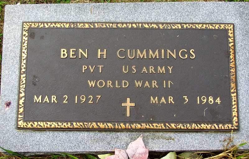 | CUMMINGS, BEN H. | MAR 2 1927 | MAR 3 1984 | "PVT US ARMY" "WORLD WAR II" Christian Cross emblem |