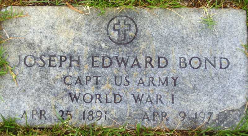 | BOND, JOSEPH EDWARD | APR 25 1891 | APR 9 1976 | "CAPT US ARMY" "WORLD WAR I" Christian Cross in circle emblem; stone damaged on death date |