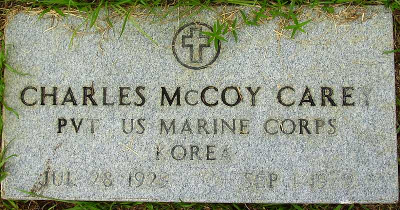 | CAREY, CHARLES McCOY | JUL 28 1929 | SEP 1 1979 | "PVT US MARINE CORPS" "KOREA" Christian Cross in circle emblem |