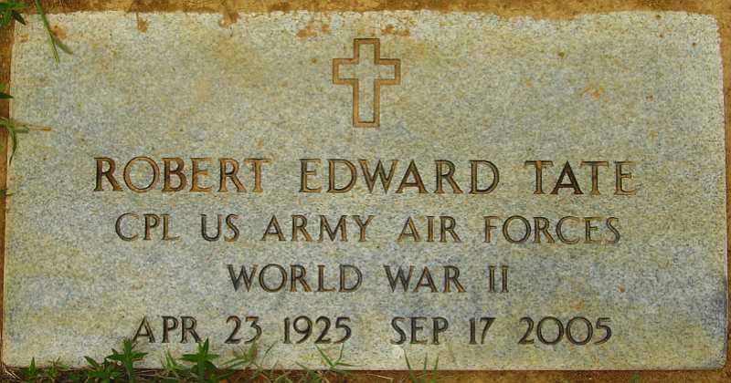 | TATE, ROBERT EDWARD | APR 23 1925 | SEP 17 2005 | "CPL US ARMY AIR FORCES" "WORLD WAR II" Christian Cross emblem |