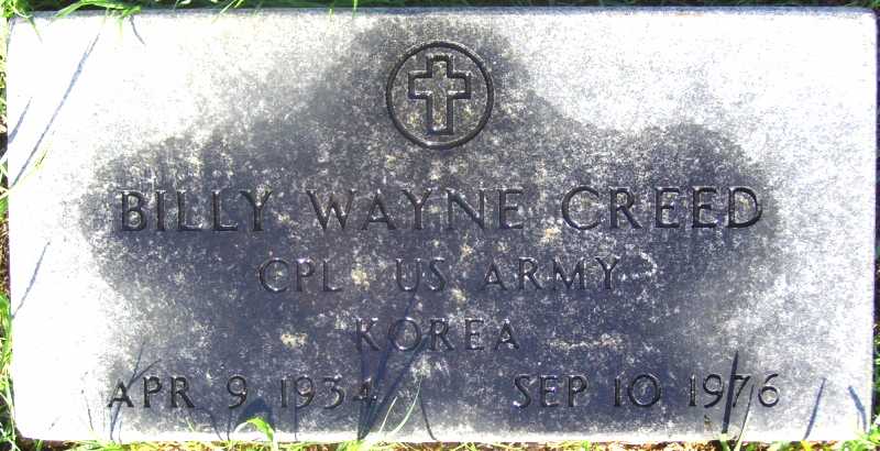 | CREED, BILLY WAYNE | APR 9 1934 | SEP 10 1976 | "CPL US ARMY" "KOREA" Christian Cross in circle emblem |