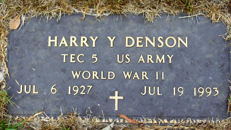 | DENSON, HARRY Y. | JUL 6 1927 | JUL 19 1993 | "TEC 5 US ARMY" "WORLD WAR II" Christian Cross emblem |