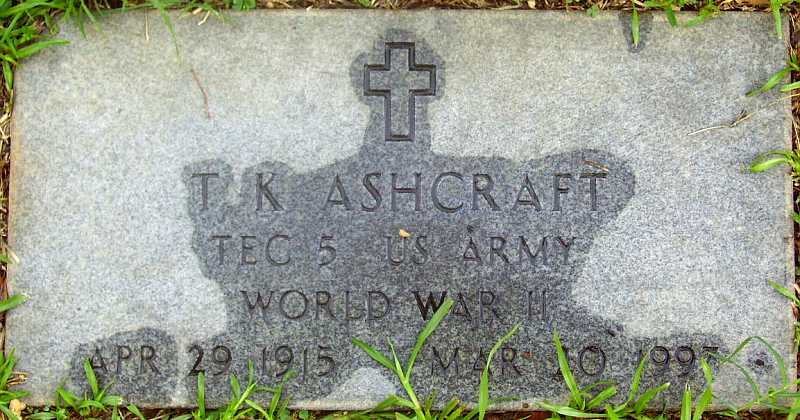 | ASHCRAFT. T. K. | APR 29 1915 | MAR 20 1997 | "TEC 5 US ARMY" "WORLD WAR II" Christian Cross emblem |