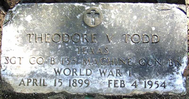 | TODD, THEODORE V. | APRIL 15 1899 | FEB 4 1954 | "SGT CO B 133 MACHINE GUN BN" "WORLD WAR I" Christian Cross in circle emblem |