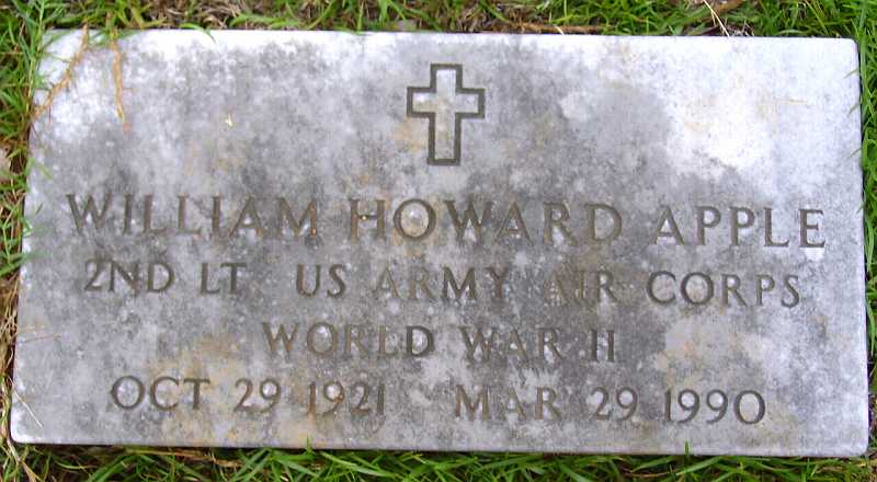 | APPLE, WILLIAM HOWARD | OCT 29 1921 | MAR 29 1990 | "2ND LT US ARMY AIR CORPS" "WORLD WAR II" Christian Cross emblem |