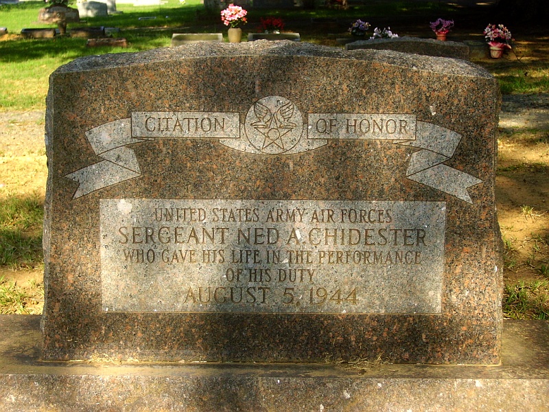 | CHIDESTER, NED A. [ Arthur? ] | [ 1921 ] | AUGUST 5, 1944 | "CITATION OF HONOR" "UNITED STATES ARMY AIR FORCES" "SERGEANT" "WHO GAVE HIS LIFE IN THE PERFORMANCE OF HIS DUTY" Citation of Honor emblem |