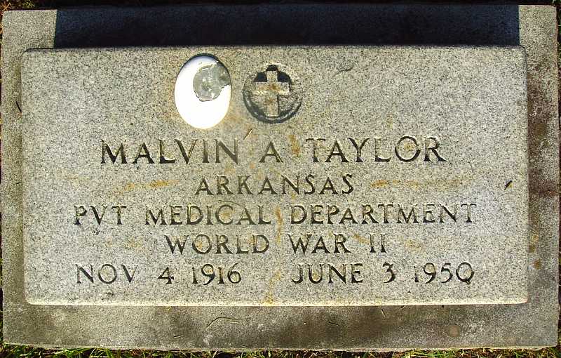 | TAYLOR, MALVIN A. | NOV 4 1916 | JUNE 3 1950 | "ARKANSAS" "PVT MEDICAL DEPARTMENT" "WORLD WAR II" Christian Cross in circle emblem; damaged and faded photo? on stone |