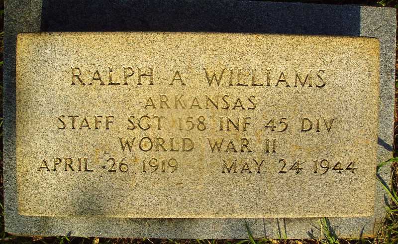 | WILLIAMS, RALPH A. | APRIL 26 1919 | MAY 24 1944 | "ARKANSAS" "STAFF SGT 158 INF 45 DIV" "WORLD WAR II" |