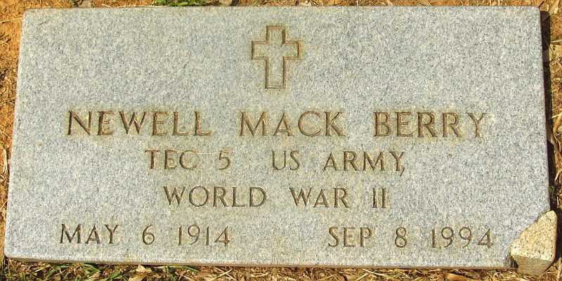 | BERRY, NEWELL MACK | MAY 6 1914 | SEP 8 1994 | "TEC 5 US ARMY" "WORLD WAR II" Christian Cross emblem; corner broken on stone |