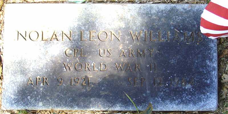 | WILLIAMS, NOLAN LEON | APR 9 1921 | SEP 12 1984 | "CPL US ARMY" "WORLD WAR II" |