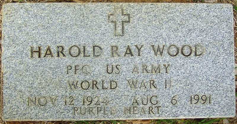 | WOOD, HAROLD RAY | NOV 12 1924 | AUG 6 1991 | "PFC US ARMY" "WORLD WAR II" "PURPLE HEART" Christian Cross emblem |