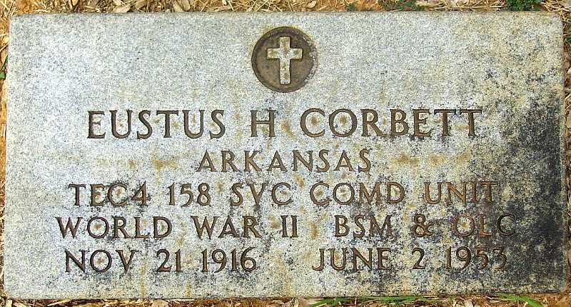 | CORBETT, EUSTUS H. | NOV 21 1916 | JUNE 2 1953 | "ARKANSAS" "TEC4 158 SVC COMD UNIT" "WORLD WAR II BSM & OLC" Christian Cross in circle emblem |