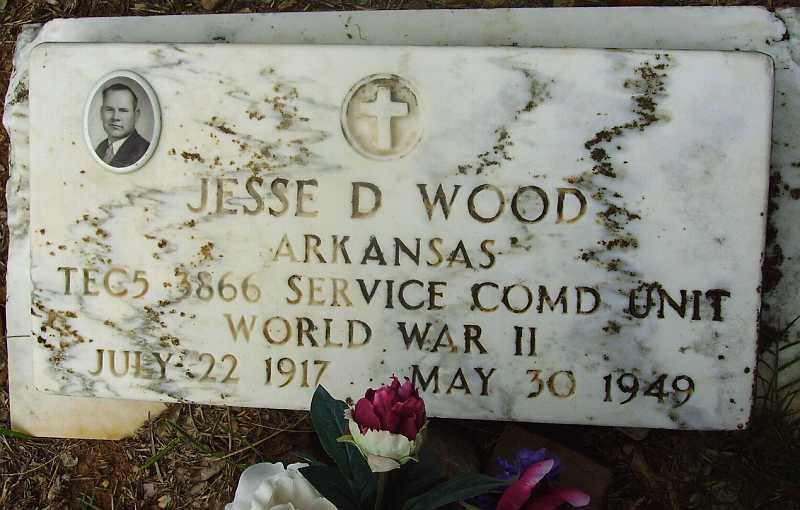 | WOOD, JESSE D. | JULY 22 1917 | MAY 30 1949 | "ARKANSAS" "TEC5 3866 SERVICE COMD UNIT" "WORLD WAR II" Christian Cross in circle emblem; Photo attached to stone |