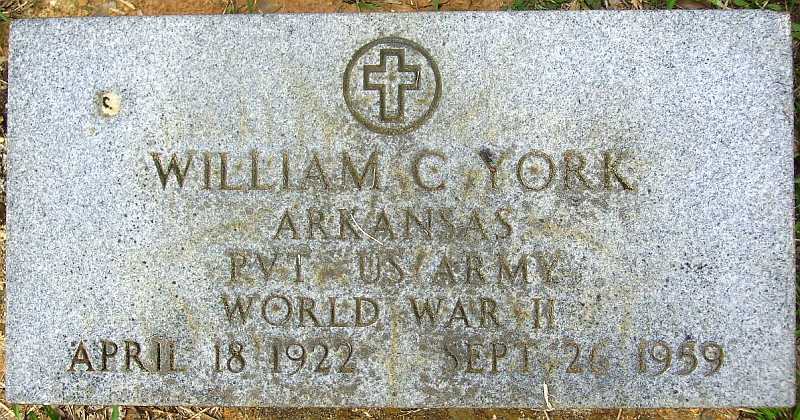 | YORK, WILLIAM C. | APRIL 18 1922 | SEPT 26 1959 | "ARKANSAS" "PVT US ARMY" "WORLD WAR II" Christian Cross in circle emblem |