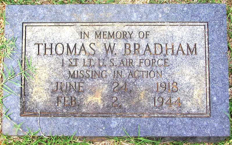| BRADHAM, THOMAS W. | JUNE 24, 1918 | FEB. 2, 1944 | "IN MEMORY OF" "1ST LT. U. S. AIR FORCE" "MISSING IN ACTION" |