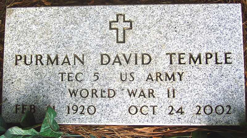 | TEMPLE, PURMAN DAVID | FEB 11 1920 | OCT 24 2002 | "TEC 5 US ARMY" "WORLD WAR II" Christian Cross emblem |