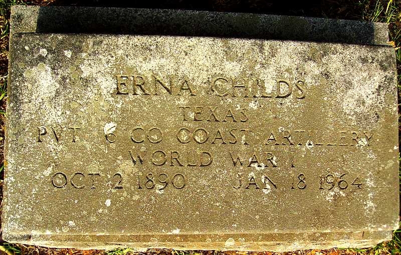 | CHILDS, ERNA | OCT 2 1890 | JAN 18 1964 | "TEXAS" "PVT 6 CO COAST ARTILLERY" "WORLD WAR I" |