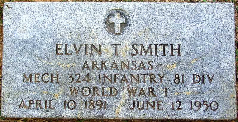 | SMITH, ELVIN T. | APRIL 10 1891 | JUNE 12 1950 | "ARKANSAS" "MECH 324 INFANTRY 81 DIV" "WORLD WAR I" Christian Cross in circle emblem |