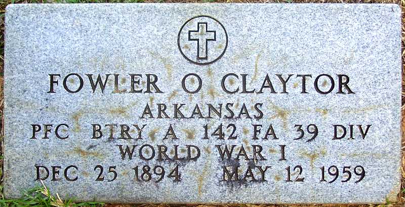 | CLAYTOR, FOWLER O. | DEC 25 1894 | MAY 12 1959 | "ARKANSAS" "PFC BTRY A 142 FA 39 DIV" "WORLD WAR I" Christian Cross in circle emblem |