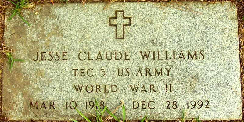| WILLIAMS, JESSE CLAUDE | MAR 10 1918 | DEC 28 1992 | "TEC 3 US ARMY" "WORLD WAR II" Christian Cross emblem |